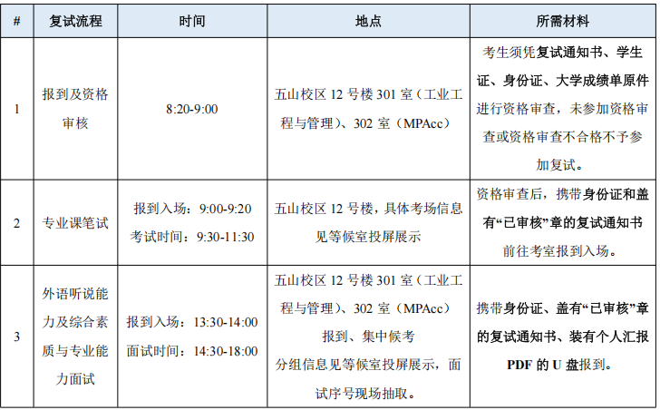 1.9月16日开始考生可登录系统动态查询是否获得面试资格,确认是否参加复试和下载打印复试通知书;如有放弃复试的考生,请发送放弃声明(模板见附件1),并连同身份证照片发送至各项目邮箱(工业工程与管理:scutme@scut.edu.cn、MPAcc:mpacc@scut.edu.cn)。