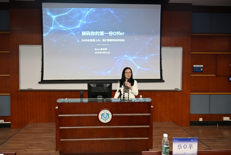 开篇,蔡卓苹站在AI时代招聘者的角度,详细阐释了当前招聘中面试官不再只是企业的HR负责人,还多了AI数字人这一全新角色,形成了“人工+智能”的双重筛选格局。她着重指出当今求职者的简历需经过系统算法初筛和HR人工速筛。她建议同学们积极主动地适应变化,提升数字化能力。